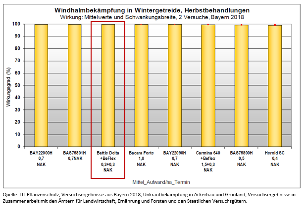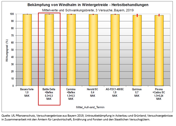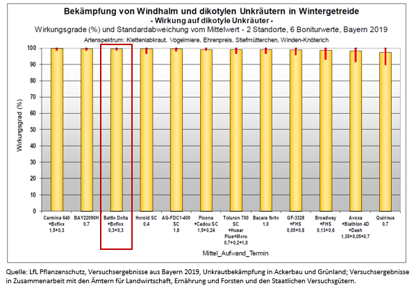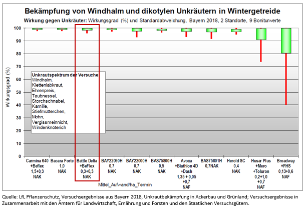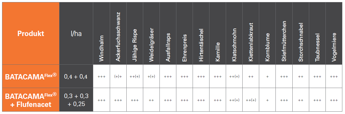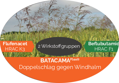 Wirkung von Batacama Flex (0,3 l/ha Battle Delta + 0,3 l/ha BeFlex) auf Unkräuter und Windhalm