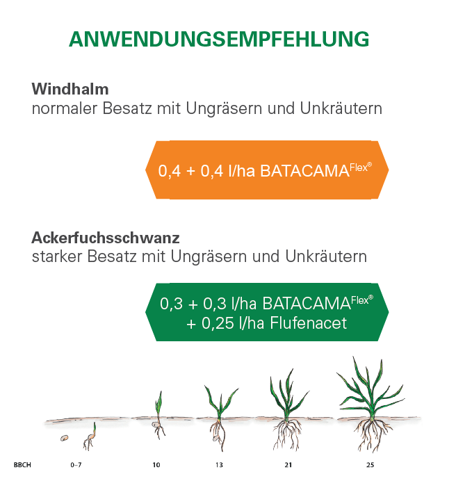 Ackerfuchsschwanz:  0,3 + 0,3 l/ha + 0,25 l/ha Flufenacet-Produkt