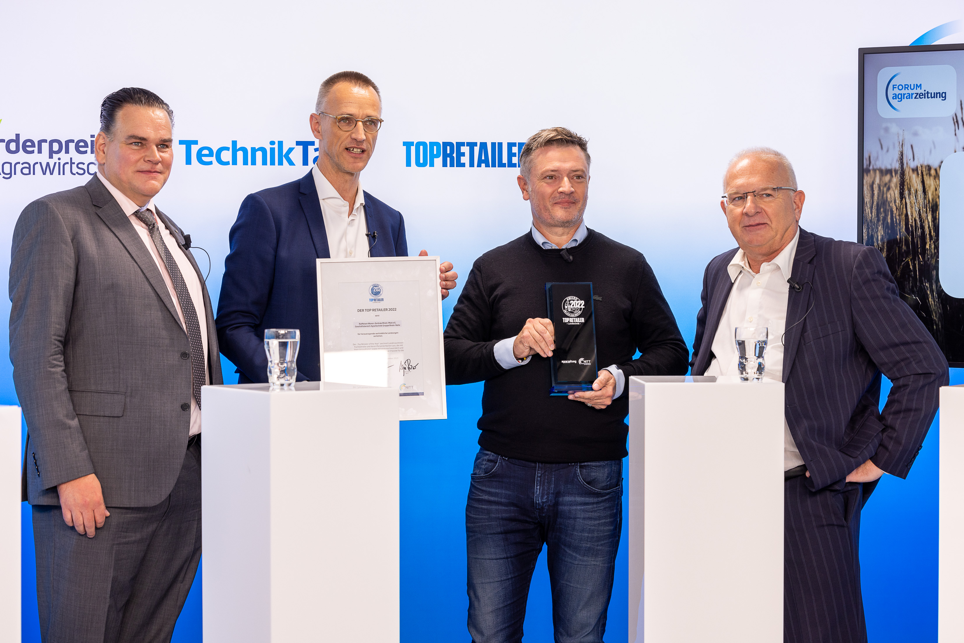 Die Fachpublikation agrarzeitung hat gemeinsam mit dem New Ideas Think Tank (NITT) den Award „Top Retailer – Landtechnik 2022“ an die Agrartechnik-Gruppe Rhein-Nahe der Raiffeisen Waren- Zentrale Rhein-Main eG (RWZ) verliehen. In einem unabhängigen, wissenschaftlich basierten Diagnostikverfahren hat die Gruppe 90 von 100 möglichen Punkten und damit Goldstatus erreicht. Christoph Kempkes, Vorstandsvorsitzender der RWZ Rhein-Main eG, bedankte sich bei der Verleihung in Frankfurt am 4./5. November: „Wir können stolz auf die Agrartechnik-Gruppe Rhein- Nahe sein. Die Technik ist eine der starken Bereiche in unserem Konzern; sie kennt seit einigen Jahren nur eine Richtung – und zwar aufwärts. Wir stecken uns ambitionierte Ziele und arbeiten konsequent auf diese hin. Das alles gelingt aber auch nur mit einem Team, das zielstrebig handelt und an einem Strang zieht.“