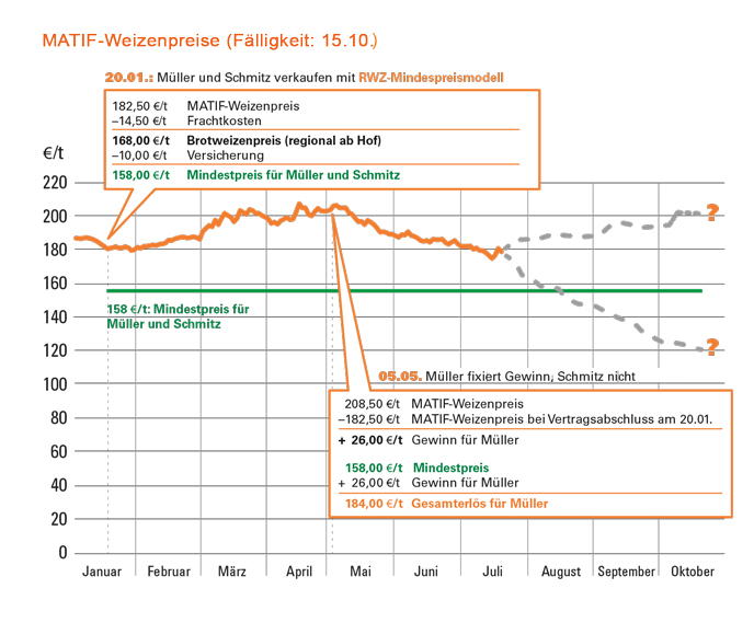 Das RWZ-Mindestpreismodell ist eine Versicherung gegen fallende Preise. Schwankungen an den Agrarmärkten können hiermit abgefangen werden. Gegen Zahlung einer Art Versicherungsprämie wird der aktuelle Getreide- oder Rapspreis nach unten abgesichert, ohne die Chance auf einen steigenden Preis aufzugeben. Sie können sich an jedem Ihnen günstig erscheinenden Tag bis zu einem vereinbarten Zeitpunkt (Fälligkeit) Ihren Verkaufspreis fixieren. Somit sichern Sie sich einen fixen Mindestdeckungsbeitrag für Ihre betriebswirtschaftliche Kalkulation, können aber trotzdem noch von steigenden Preisen profitieren.