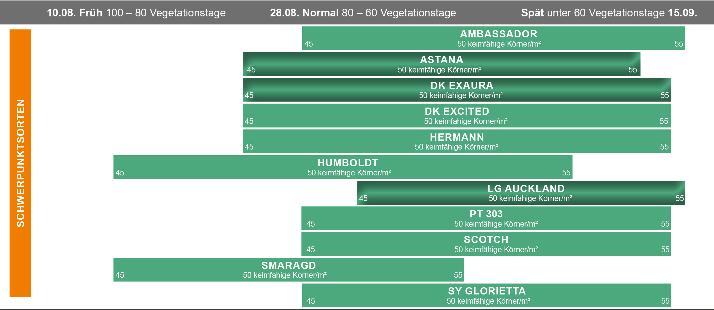 • Kurze, kompakte, standfeste, frühe MSL-Hybride mit rascher Herbstentwicklung
